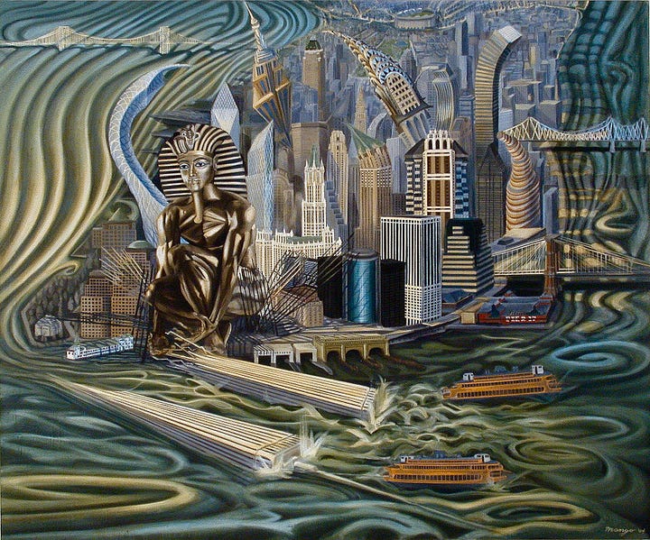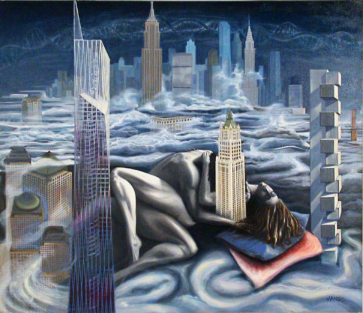 Anyone who’s called the city home since before 2000 was irrevocably altered or influenced by the most momentous occurrence in New York: 9/11. It changed the landscape, physically and psychologically, in ways too profound to enumerate. Being six blocks from ground zero, experiencing the fallout and the gruesome aftermath, I couldn’t pick up a paintbrush. Over two years later, whether catharsis or exorcism of the collateral damage, human and otherwise, I finally painted Burial at Sea and then Fallen Towers.